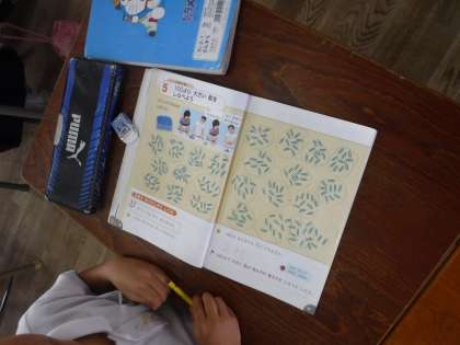 大きな数の数え方を学習していました。10ずつの塊を○で囲んで、数えていました。