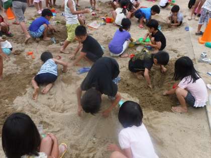 7月8日(金)1年生が運動場の砂場で、生活科として砂遊びの学習をしました。