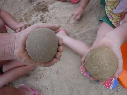 深〜く穴を掘ったり、きれいなまん丸のお団子をつくったり、寝そべったりして砂の感触を楽しんでいました。