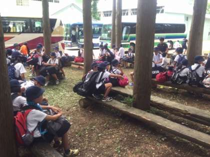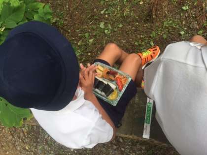 「宿舎に無事着きました。晴れです。これから弁当を食べます。」
