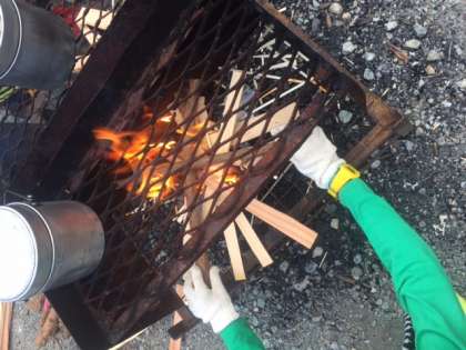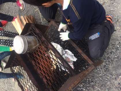 食材を協力して調理師、飯盒でお米を炊いていきます。