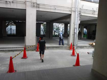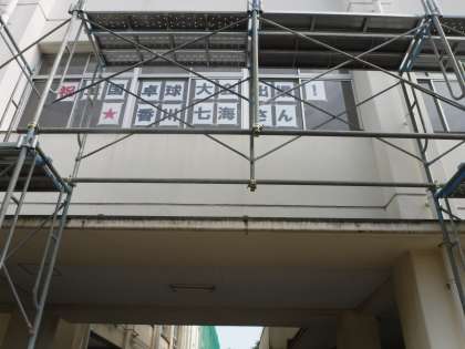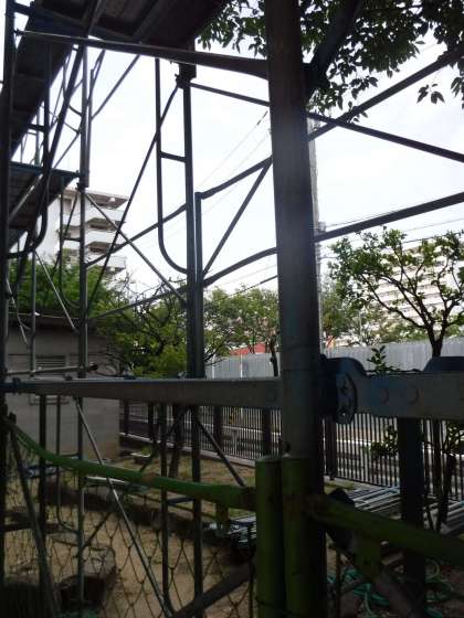 職人さんがたは、さすがです。たった1日で、これだけ足場が組みあがっていくものなですね。学校やいきいき活動、体育施設開放事業それぞれの活動になるべく影響がないようにと、厳しい日程・条件の下、作業を進めていただいています。