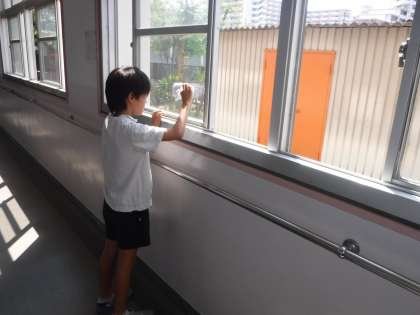 雑巾や箒を手にした子ども達が校内のいろんな場所を分担してきれいにしてくれています。夏休みの間に埃がたまっているところもあったかもしれませんね。「ありがとう。」って学校も喜んでいることでしょう。