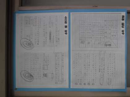 職員室前に児童のノートをコピーしたものを掲示しています。