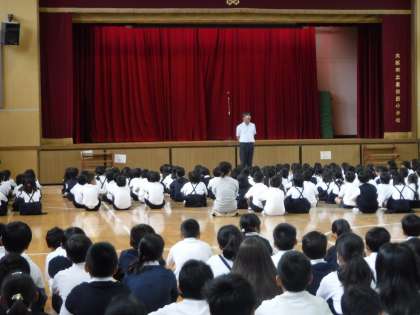 ピロティにきれいに靴を並べて、学年ごとにまっすぐ整列して始まるのを待っていました。校長先生からは、玄関の水槽を管理作業員さんが修理して使えるようにしてくださったこと、数種類の魚が棲んでいるので静かに鑑賞してほしいことをお話されました。