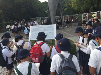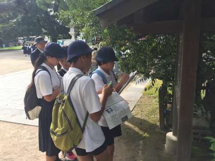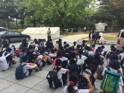 6年生は、平和記念公園に到着し、資料館近くでお弁当を食べました。