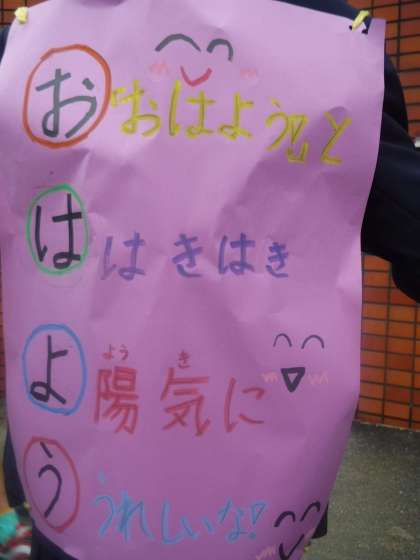 当番の子ども達がサンドイッチマンのような「おはよう」の標語を掲げて、朝のあいさつをしています。学校の中でも、気もちのよい元気なあいさつの声が響いていました。