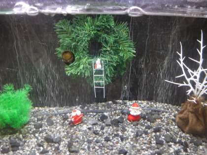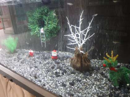 玄関の水槽の写真をご紹介しましたが、管理作業員さんが午前中に更に手を加えて、サンタさんの仲間を連れて来てくれました。