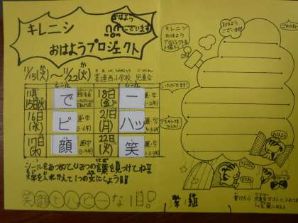 先週から児童会を中心に取り組んできたあいさつ運動では、しっかり元気にあいさつできた子ども達に1枚ずつ暗号入りの小さなシールを渡していました。子ども達は、シールに書かれた暗号を読み解きながら黄色い挨拶カードにそのシールを集めて貼っていきます。