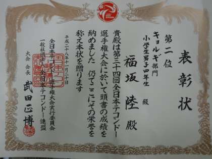 4年1組の福坂 陸さんが先週の日曜日に行われた第34回 全日本テコンドー選手権大会に出場し、キョルギ(組手)部門・小学生男子4年生において、第2位の成績を納めました。職員室に表彰状とメダルを届けてくれました。
