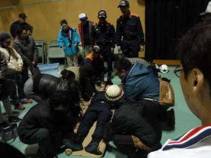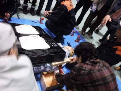 その後、ジャッキアップでがれきの下敷きになった方を救助する訓練、ケガをした方を運搬する訓練、呼吸が止まって心肺停止状態の方の救命措置を施す訓練をしました。