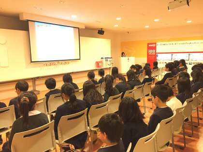 午前中は明治なるほどファクトリー(旧明治ヨーグルト館)でヨーグルトの製造工程や乳酸菌のことを学習し、実際に工場で牛乳やヨーグルトなどの製品ができあがる様子を見学しました。