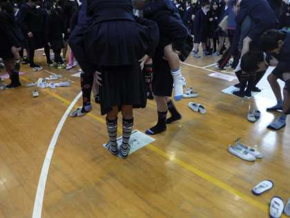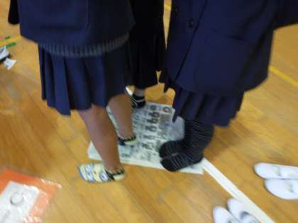 たて割り班ごとに集会委員会とジャンケンをして、負けた班は新聞を半分に折っていきます。班の子ども達は、その新聞紙の島に乗らなければなりません。子ども達は、身を寄せ合ったりおんぶをしたりして、島から落ちないように楽しんでいました。