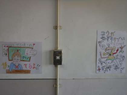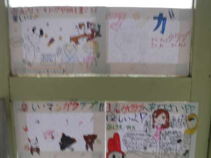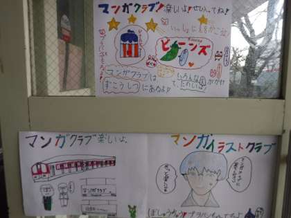 漫画クラブのポスターが校舎内にたくさん貼っています。3年生の教室の近くや玄関付近に貼ることで、宣伝効果を上げています。そして、何より書き込みの密度が濃いので、描き手の熱意が1枚1枚から伝わってきます。