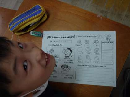 目には見えないカルシウムを「カルちゃん」と呼んで、非常にわかりやすく子ども達に教えてくださいました。お話の中に、「25歳までは骨の中にカルシウムを蓄えていくことができる」という内容がありました。これを聞いて、子ども達はしっかりカルシウムを含む食べ物をとろうと思ったに違いありません。