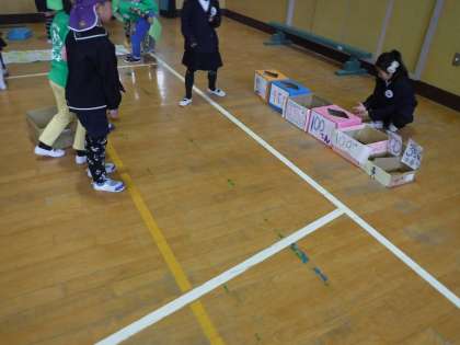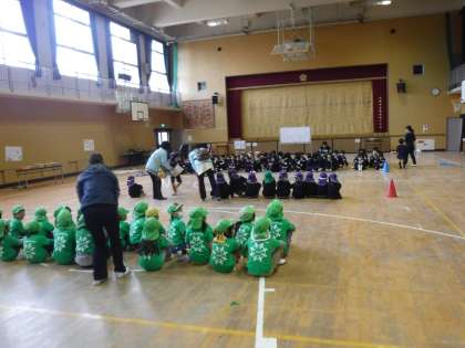 2月21日(火)体育館で、1年生が西喜連保育所・カリーノ保育園の子ども達を招待して、わくわく交流会を行いました。