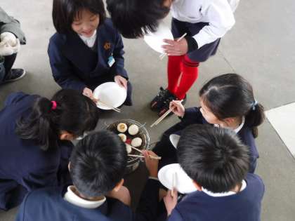 雨に濡れないピロティに七輪を並べ、班ごとに火を起こしていきました。そして、お待ちかねのお餅を網の上に乗せました。子ども達は、お箸とお皿を両手に持って、キラキラした目でお餅が焼ける様子を見つめていました。