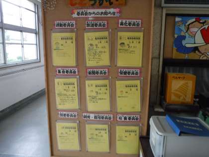 玄関に委員会活動のカードがきれいに掲示されています。