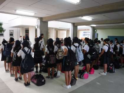 晴天に恵まれ、6年生が修学旅行に出発します。