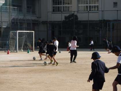 今日の集会は、ペアで協力してボールをけって競い合うゲームをしました。 みんな笑顔で楽しんでいました。