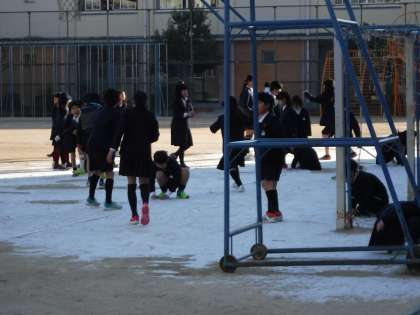 今朝、運動場の片隅に、少しだけ雪が積もっていました。