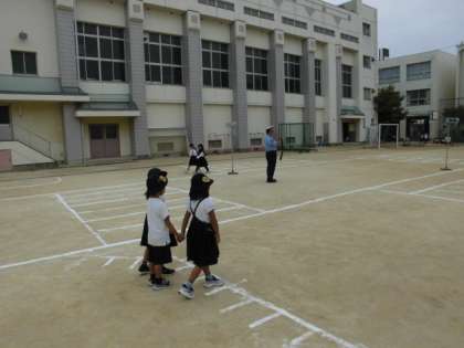 また、運動場の線を横断歩道に見立てて、横断歩道を渡る練習をしました。