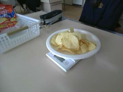 「ポテトチップスを使って、自分たちが普段おやつとして食べている量は・・?」