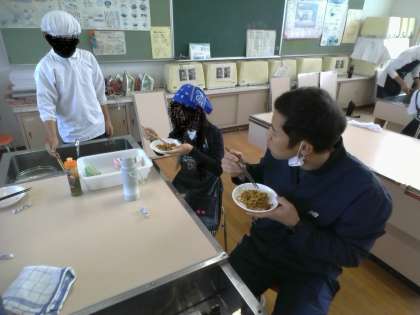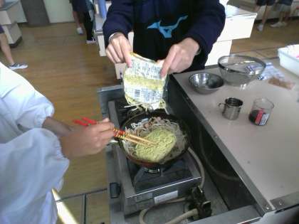 6年生の子どもたちは、エプロンを着て、ウインナーを切ったり、もやしを洗ったりしていました。「ちょっと、火が強くない?」「このお皿洗ったとくね!」等、班の友だちと声をかけあい、協力して調理実習をしていました。