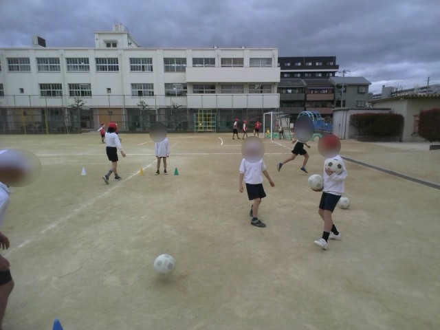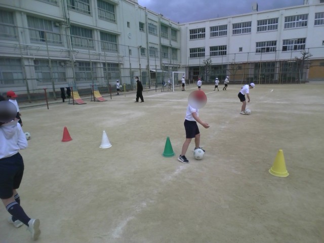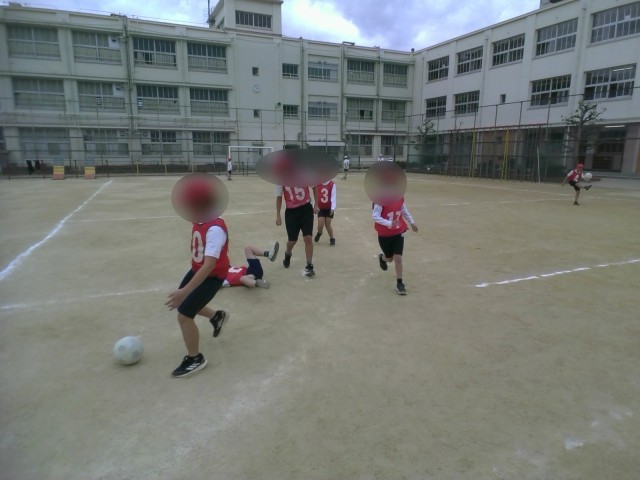ゴール型のボール運動に取り組んでいます。子どもたちは、チームで協力しながらパスをつなぎ、相手のゴールを目指してゲームを楽しんでいます。