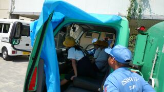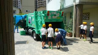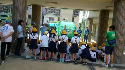 6月6日(木)4年生が環境事業局の方々による出前授業を受けました。前半は、パッカー車を見学させていただきました。回収するごみの種類によって音楽が違うことやお仕事をされているときには危険なので近づかないことなどを教えていただきました。ごみ収集口を間近で見学したり、運転席に乗せていただいたり、普段できない体験をさせていただきました。