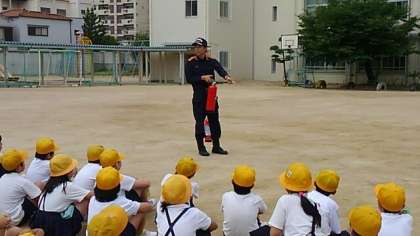 そのあとは、5・6年生対象に、消火器の訓練をしました。消火器は5mの距離で15分間使えること、天井に届くほどの炎は消すことができないので逃げることなどを教えていただきました。