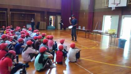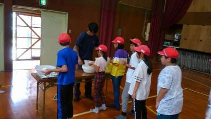 うどん作りです。明日、昼食煮込みカレーに使うので、みんな一生懸命説明を聞いています。上手に作られるでしょうか。
