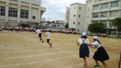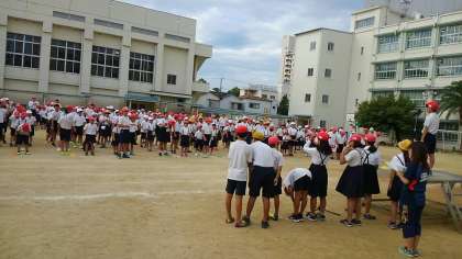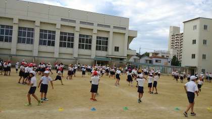 10月3日(木)児童集会を全校児童で行いました。「丸三角四角鬼ごっこ」をしました。司会の集会委員が「丸、丸、丸、丸、四角」と言ったら、四角い物にタッチします。先に鬼にタッチされたらアウトです。高学年と低学年がペアになって協力して逃げていました。そのあとは、「増え鬼」をしました。みんなとても楽しそうでした。