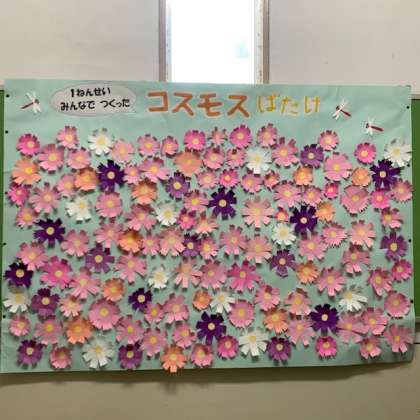 1年生の階段の掲示板をみんなで作ったコスモスで飾りました。