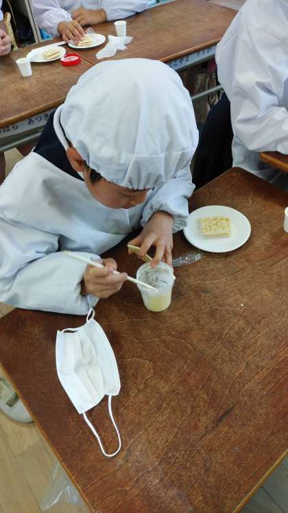 バター作りは、ペアで協力して行いました。かきまぜた時にできるバターミルクに子どもたちはとても驚いていました。できたバターは、クラッカーに乗せておいしくいただきました。またお家でも作ってみてください。