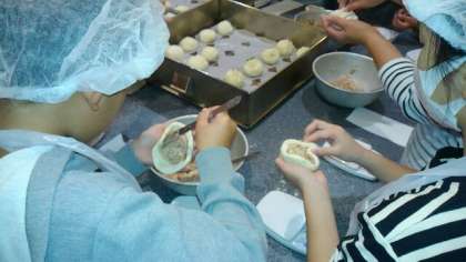 12月7日(土)PTA社会見学がありました。豚まん手作り体験をしました。皮を伸ばして適量包みました。親指と人差し指でつまみながら包むのが難しそうでした。