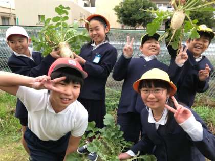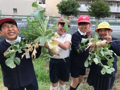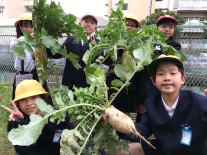 9月24日に植えた田辺ダイコンの種は、約4カ月を経て大きなダイコンへと成長しました。5年生で収穫して持って帰ります。いただきます。