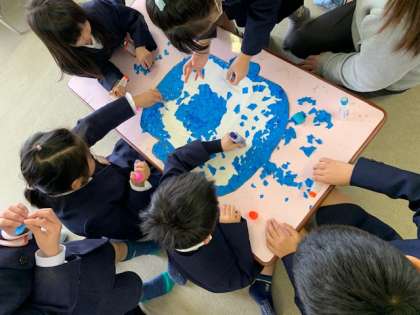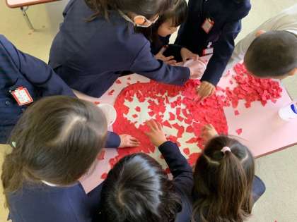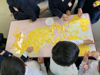 色画用紙をちぎって、みんなで貼り絵にしました。