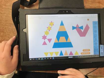 タブレットを使って、三角形の敷き詰めをしました。二等辺三角形と正三角形からいろいろな模様を作ることができました。