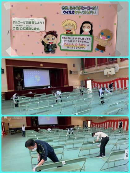 講堂の中、トイレ、すべて消毒作業を行いました。