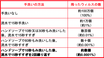 表の国立医薬品食品衛生研究所の研究は、手洗いによってどの程度ウイルスが除去できるのか示しています。