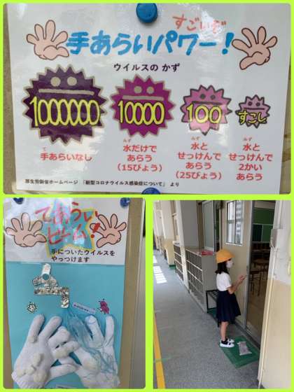 学校でも手洗いの大切さを指導したり、入室前にはアルコール消毒を行っています。ご家庭でも手の洗い方について、改めてお声かけをお願いします。また、登校日には、必ずハンカチを持たせてください。