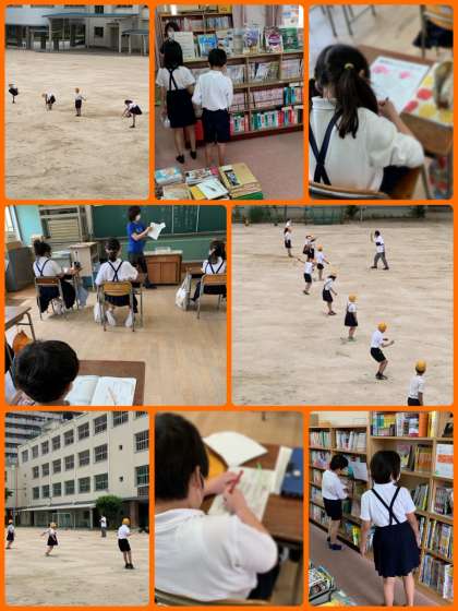 4年生は教室での課題提出や「よろしくカード」の作成、その他にも1組は図書室、2組は運動場で体も動かしていました。