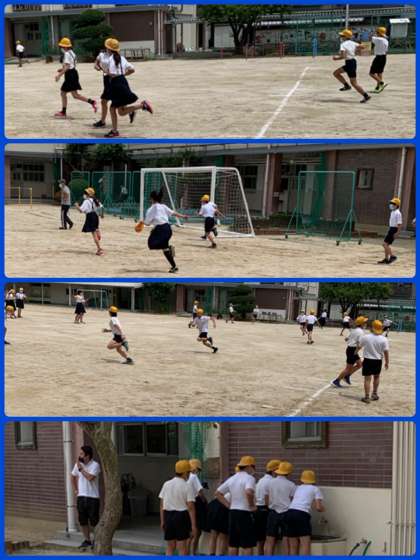 6年生もたくさん運動場に。男の子も女の子も一緒になって「ふえおに」をしていました。暑いのに、すごいパワー。感心します。私は陰に入ってじっとしていても、マスクに覆われた鼻の下は汗が噴き出るというのに…。子どもたちってすごいなぁ。終わった後は、手洗いもしっかり。もう当たり前の光景になってきましたね。