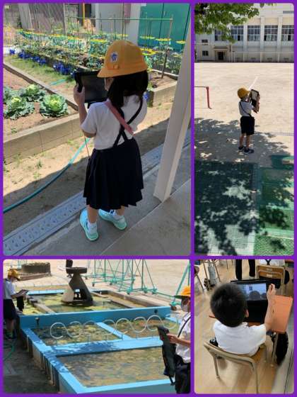 3年1組は、「春を探しにいこう!」の学習。一人一台タブレットを持って、写真を撮っていました。器用に使いこなしています。お花に、メダカに、ちょうちょに…、んー、ちょうちょを撮るってむずかしいー。「とまってよ〜、ちょうちょさ〜ん」