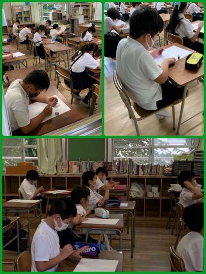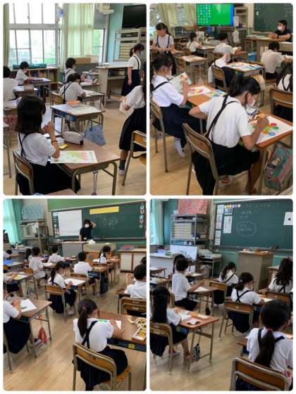 今日の3時間目、授業の様子を見に行くと、3年生と5年生が図工を。1年2組も2年1組も6年B組も。4年2組はカードの色ぬり。