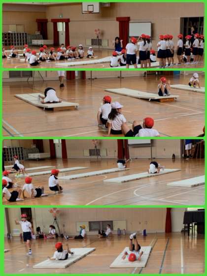前転に後転。回りやすいように坂道になっているマットもあるなど工夫されています。一人一人がチャレンジしたい技を決めて、その場所に移動して行っていました。手の位置はどうかな、頭をつけるところはどうかな、おうちのお布団でも練習してみよう。