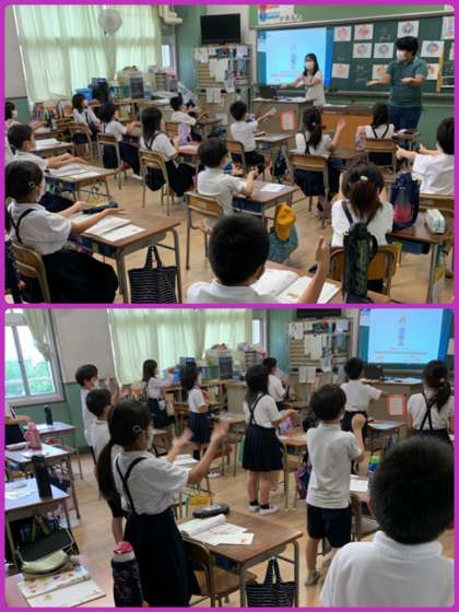 写真は3年生。いつも教えてもらっている担任の先生プラスC−NETと一緒に学習することができ、いきいきとして、とっても楽しそう。楽しく学んでしっかり英語の力を身につけていこう。グッジョブ!