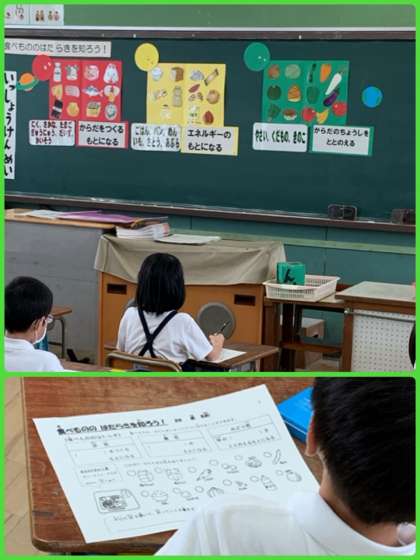 今日の栄養授業は2年生。2時間目は1組、3時間目は2組で行われました。2年生の1回目の学習は「食べもののはたらきを知ろう」。