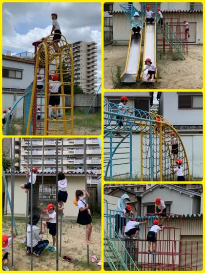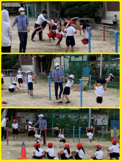 前半は、かけっこ。後半は1組は遊具、2組は鉄棒に分かれて学習しました。